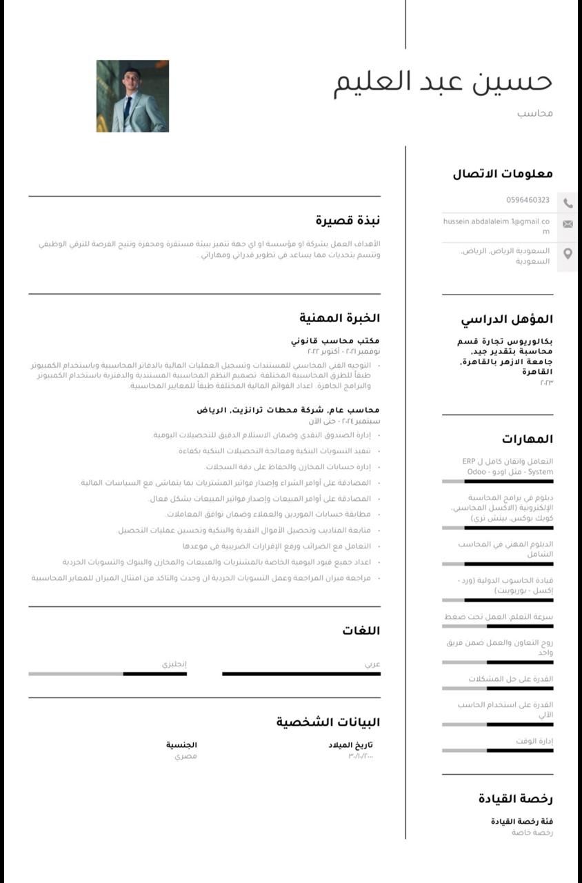 محاسب عام خبرة سنة ونصف في مجال التصنيع خبرة في الأنظمة المحاسبية ERP نظام Odoo خبرة في حسابات العملاء والموردين والمخزون والتكاليف والأقفال الشهري والسنوي اتقان البرامج المحاسبية والتعامل مع برامج الأوفيس Excel والقدرة علي اعداد التقارير المالية الدقيقة