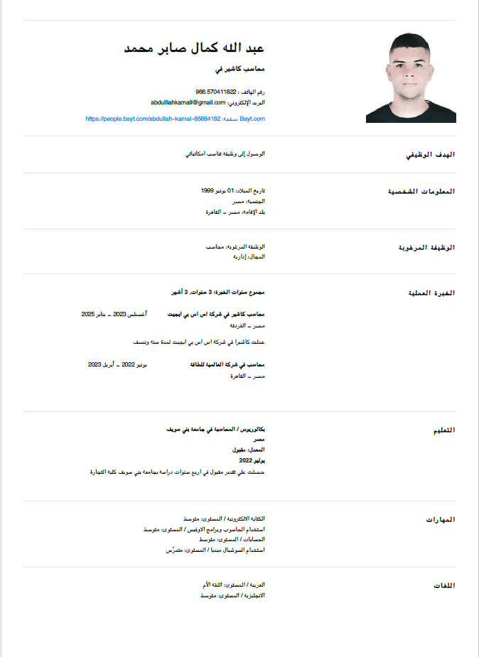 Fresh graduate with a Bachelor’s degree in commerce (Accounting) Seeking a job opportunity in the accounting field to gain practical experience and develop my professional skills. Knowledge of basic financial accounting Preparing journal entries Dealing with Microsoft Excel Basic accounts receivable and payable Accuracy and commitment Fast learner and team player Available to start work immediately