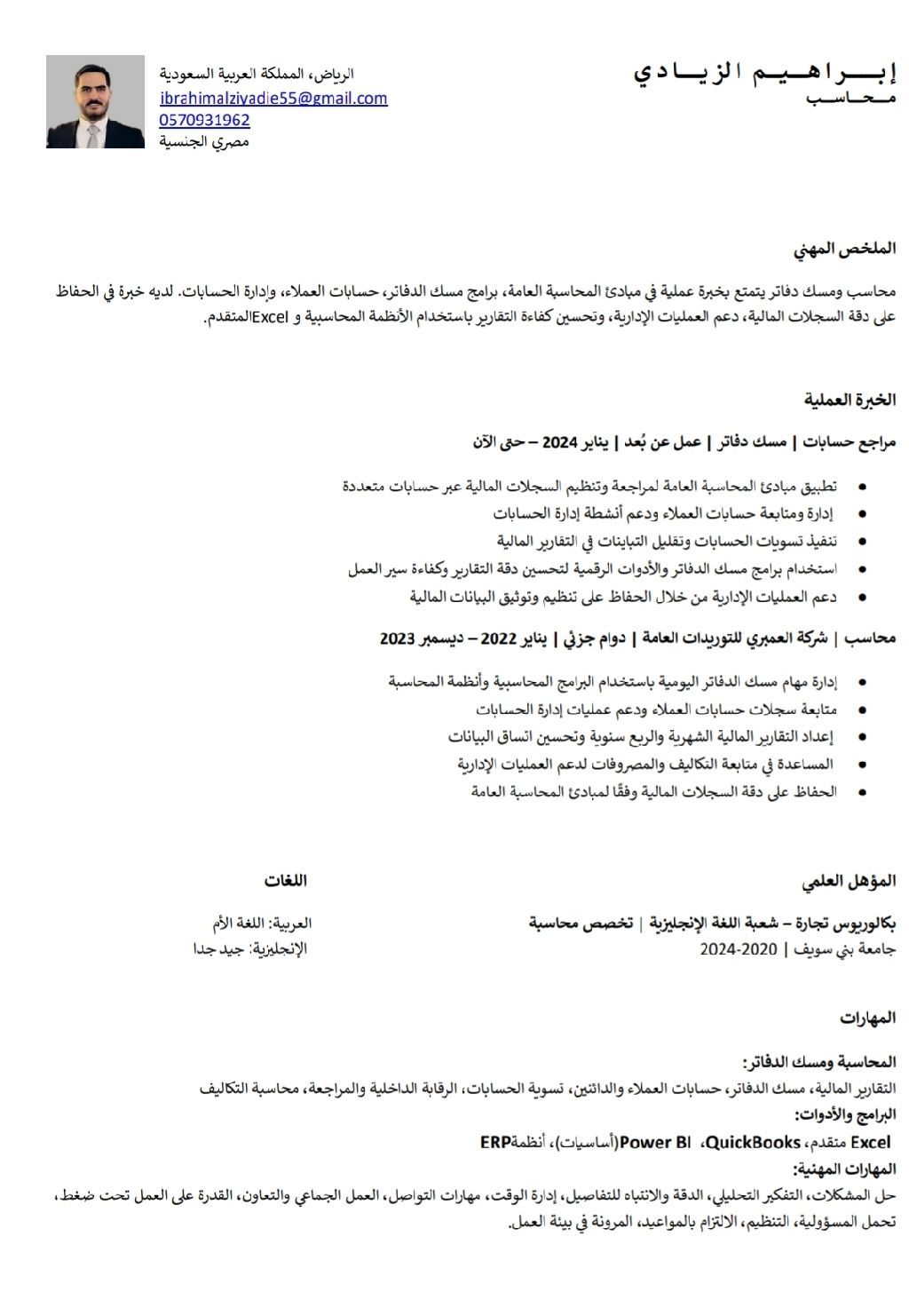 محاسب خريج تجارة انجليزي شعبة محاسبه، مقيم في الرياض خبرة سنتين. خبرة في تسجيل ومراجعة القيود اليوميه ومتابعة أرصدة العملاء والموردين والزمم المدينة والدائنة والحسابات البنكية اعداد مسيرات ورواتب الموظفين واعداد الاقرار الضريبي العمل على البرامج المحاسبية وخبرة في استخدام اكسل برامج Microsoft