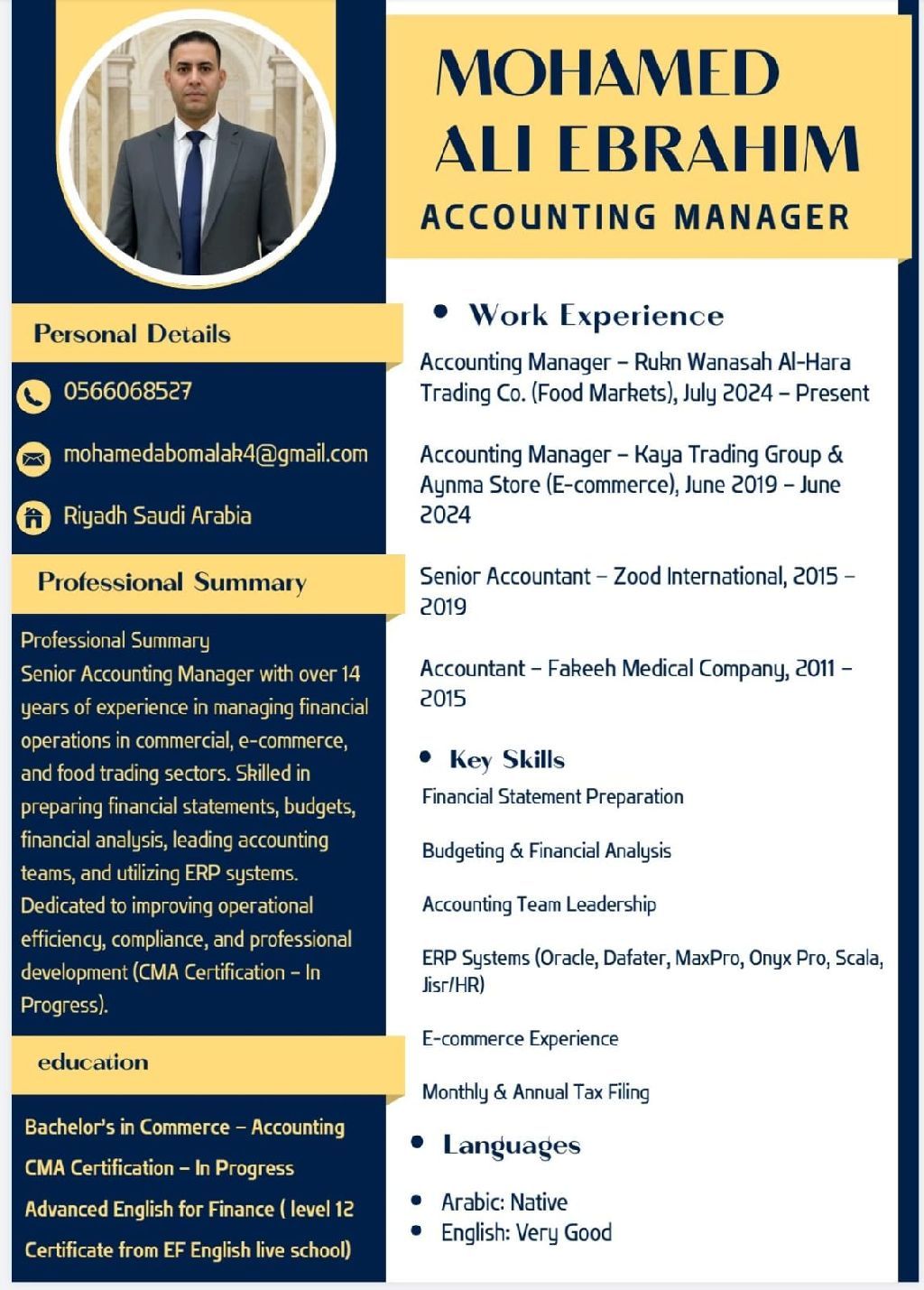 Accounts Manager with over 14 years of experience in managing the financial operations of commercial companies, the emarketing sector, the food industry, and AlOula Plastic Factory, in addition to practical expertise in accounting and financial control for fuel stations. Skilled in preparing financial statements, Proficient in ERP systems, particularly Oracle, CMA under studying
