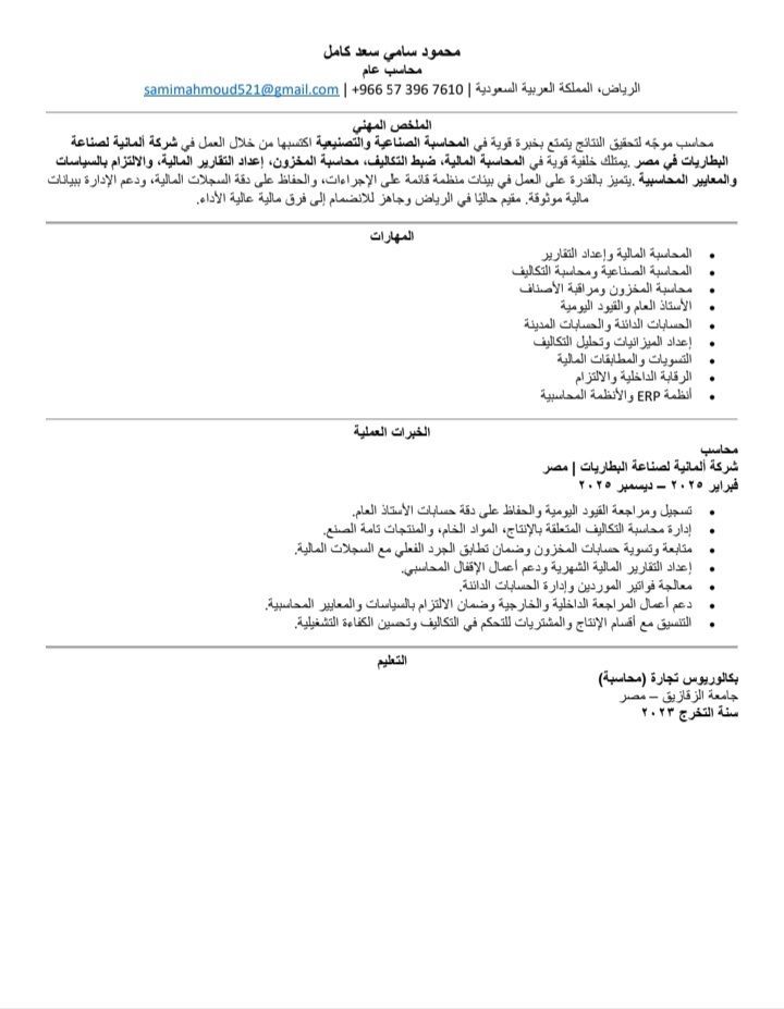 محاسب مؤهل يتمتع بخبرة عملية في الأعمال المحاسبية والمالية، ابحث عن فرصة عمل مناسبة تتيح لي توظيف مهاراتي والمساهمة في تحقيق أهداف المنشأة. اعداد القيود اليومية ومسك الدفاتر اعداد التقارير المالية والميزانيات متابعة الحسابات والمصروفات والتسويات البنكية اجادة العمل على برامج المحاسبة وExcel الدقة، الالتزام، والقدرة على العمل ضمن فريق للتواصل