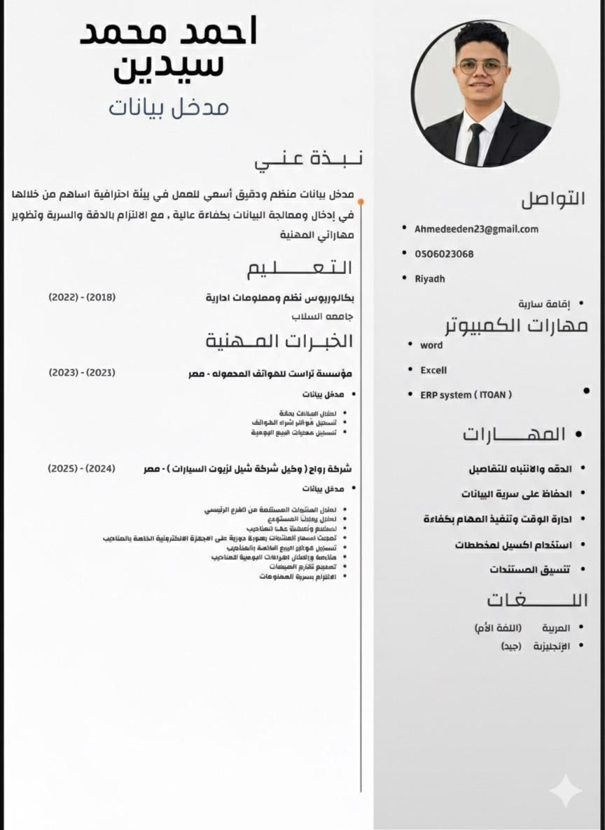 مدخل بيانات محترف لدي خبرة في ادخال وتحديث البيانات بدقة عالية مع مهارة في استخدام برامج Microsoft Office وخاصة Excel، والقدرة على تنظيم الملفات والعمل تحت الضغط مع الالتزام بالمواعيد النهائية. إقامة سارية