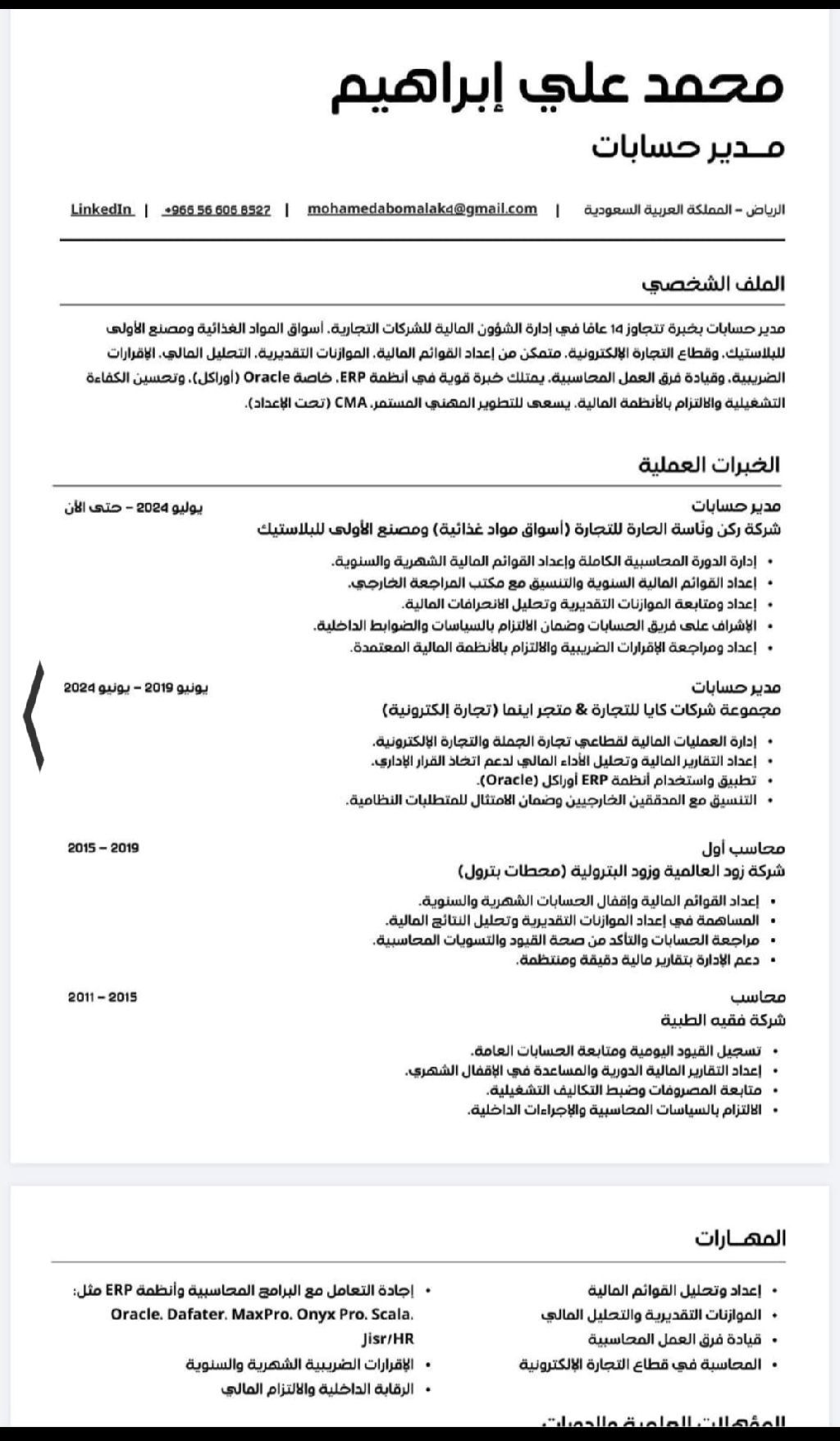 Accounts Manager with over 14 years of experience in managing the financial operations of commercial companies, the emarketing sector, the food industry, and AlOula Plastic Factory, in addition to practical expertise in accounting and financial control for fuel stations. Skilled in preparing financial statements, Proficient in ERP systems, particularly Oracle, CMA under studying