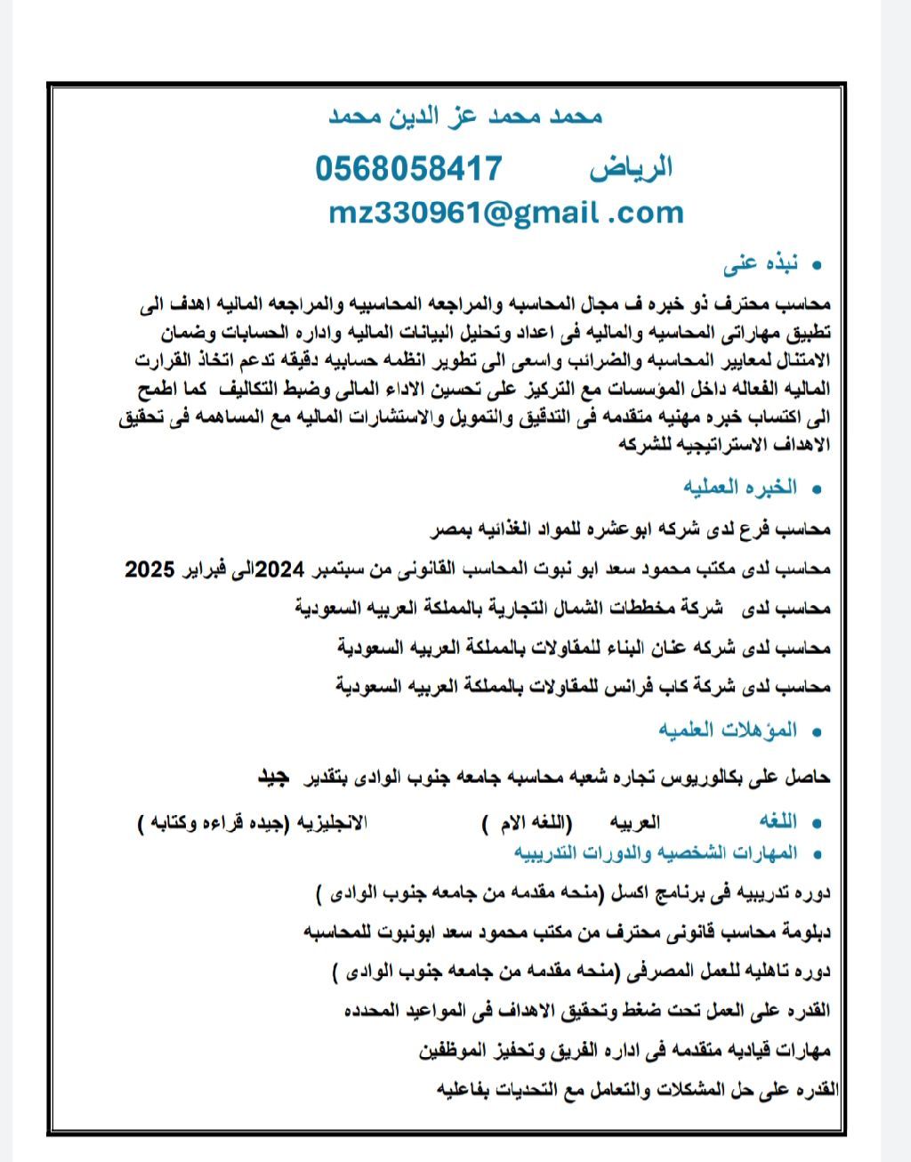 محاسب خبرة سنتين في مجال المحاسبة أقيم داخل المملكة العربية السعودية لدي خبرة في اعداد القيود اليومية التسويات البنكية اعداد التقارير المالية التعامل مع برامج المحاسبة وExcel باحترافية متابعة العملاء والموردين