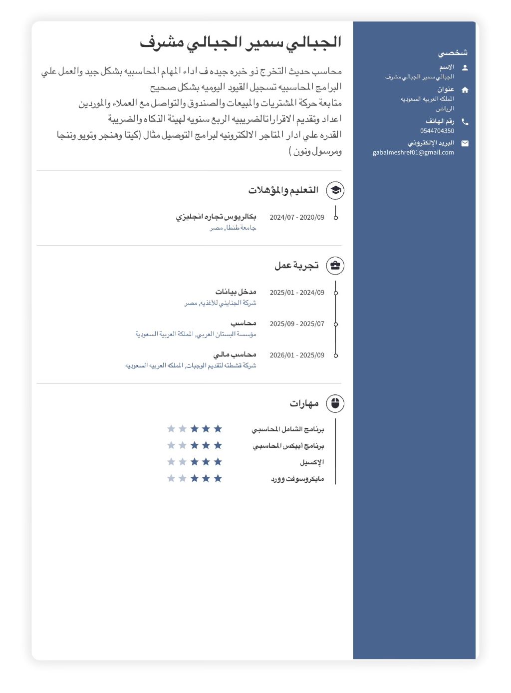 محاسب حديث التخرج قادر علي أداء المهام المحاسبية وادارة المتاجر الالكترونية بشكل سليم والعمل علي التطبيقات المحاسبية بسلاسة وتسجيل القيود اليوميه بشكل صحيح متابعة المبيعات والمشتريات وتسجيل تقارير الضريبة ورفعها لهيئة الزكاة والضريبة أيضا ادارة المتاجر الالكترونية والتوصيل والتعديل علي المنتجات وادارة كاملة للمتاجر بشكل سليم