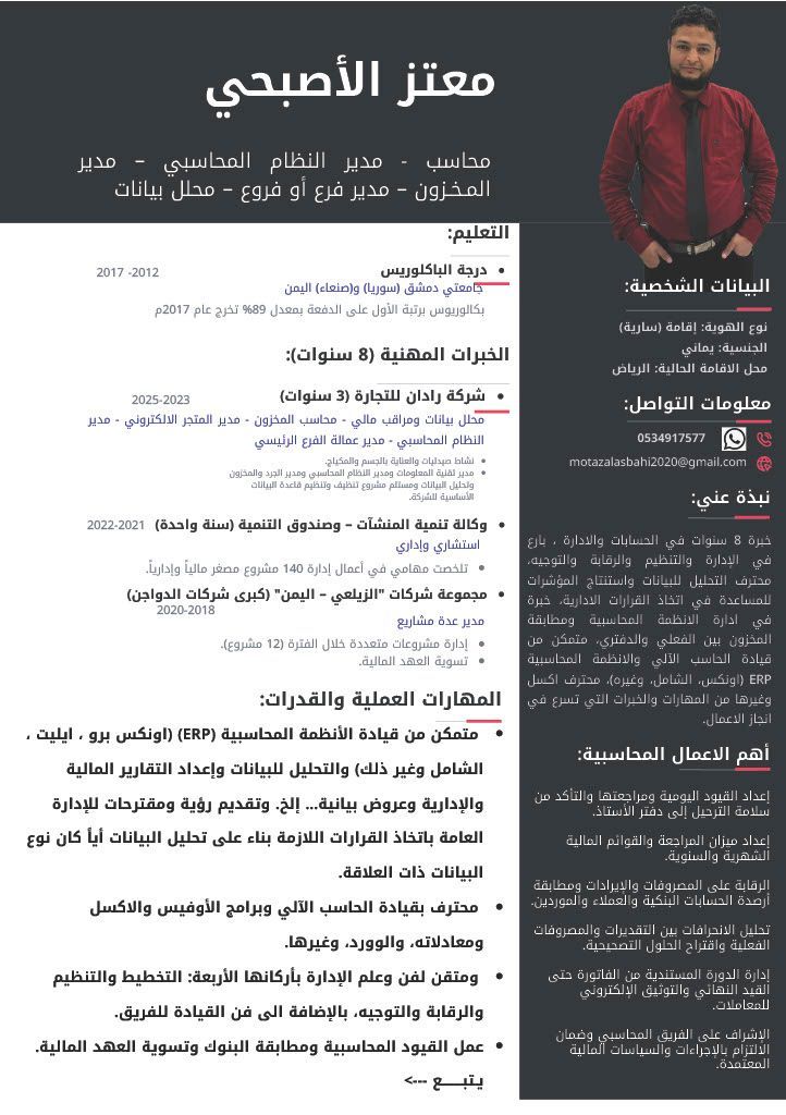 محاسب يماني خبرة 8 سنوات دوام جزئي أو يوم أو يومين بالأسبوع في الرياض أو دوام كامل مع السكن. متمكن من الحسابات وأنظمة ERP مثل أونكس برو والسامل وايليت وغيره ومطابقة البنوك والادخالات والتقارير المالية وضبط الدورة المستندية للمخزون وتحليل البيانات لمن يرغب التواصل واتساب أو اتصال مباشر على الرقم المرفق بالاعلان