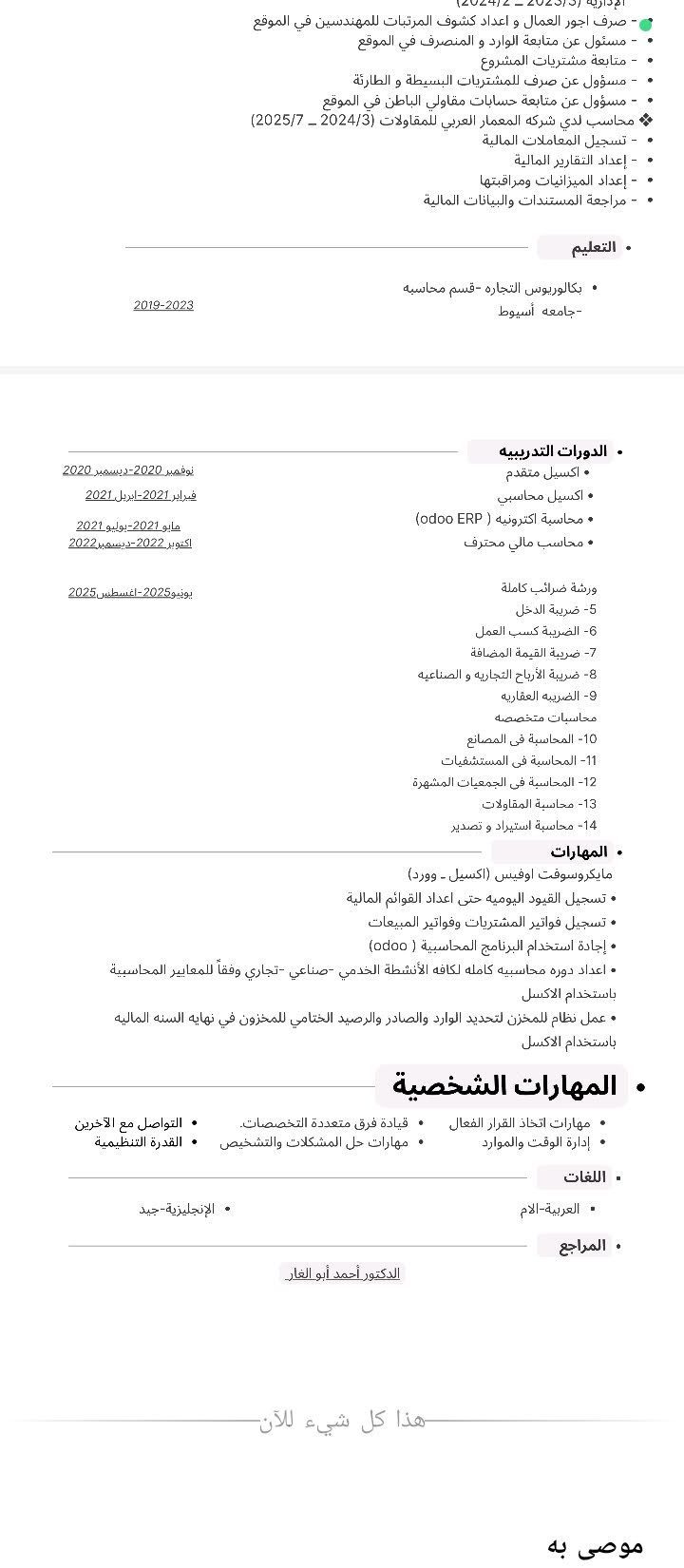محاسب مالي خبرة ثلاث سنوات لدي القدرة على اعداد دوره محاسبيه كاملة من أول اعداد القيود وصولا الى القوائم المالية ومطابقة كشوف حسابات الموردين والعملاء وعمل شيت مبيعات علي الأكسيل لتوضيح اجمالي المبيعات ولدي القدرة علي إدارة العهد والرواتب وتسوية الحسابات البنكية ولدي القدرة التحليلية في دراسة توجهات السوق وعملت علي برنامج (ERP odoo) وبرنامج (كريستال) والقدرة على العمل علي برامج Microsoft office