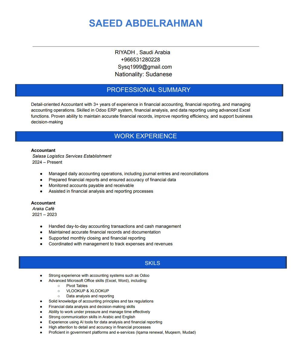محاسب محترف يجيد Odoo وExcel، بخبرة في القيود والمطابقات والتقارير المالية بدقة وكفاءة عالية