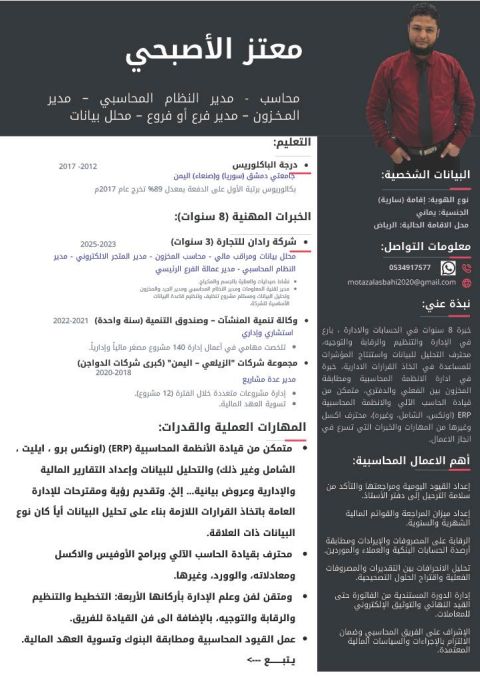 محاسب مالي حاصل على درجة البكالوريوس في المحاسبة، امتلك مهارات قوية في تنظيم الحسابات واعداد التقارير المالية. أجيد التعامل مع البرامج المحاسبية وحزمة أل Microsoft Office بدقة عالية. ابحث عن فرصة عمل تمكنني من استثمار مهاراتي والمساهمة في تطوير النظام المالي لمؤسستكم