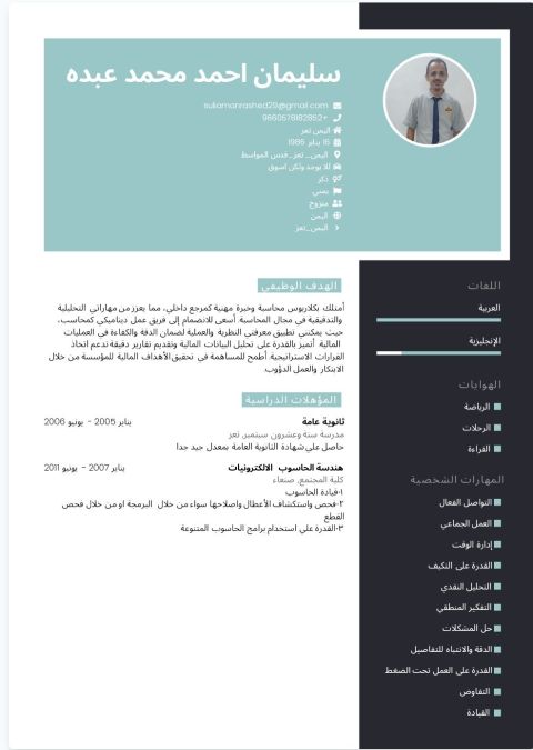 أنا سليمان أحمد محمد. يمني الجنسية حاصل علي شهادة الحاسوب. وشهادة المحاسبة لدي خبرة في مجال الحسابات لا تقل عن عشر سنوات منها سنة في المملكة العربية السعودية