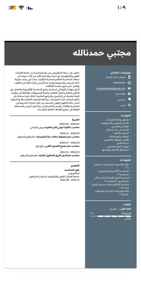 محاسب سوداني مقيم إقامة سارية وخبرة في البرامج المحاسبية بالمملكة وعمل شجرة الحسابات والقوائم المالية وتسويات البنوك وحساباتوا الموردين - توجد رخصة قيادة