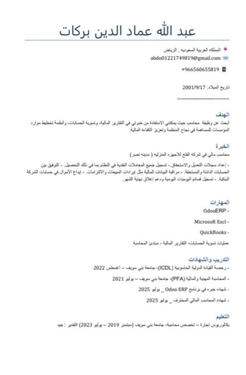 A graduate of the Faculty of commerce, Accounting Department, with experience using ERP systems and Excel, preparing journal entries and financial reports, assisting in the preparation of financial statements, and working with the Qoyod and Daftarah software programs for tracking clients and suppliers and managing bank accounts. Three years of practical experience as an accountant at Al - Mahraan Gr