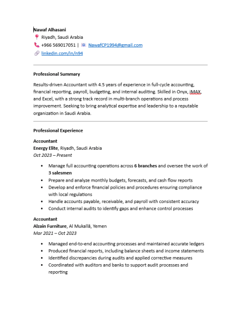 Nawaf Alhasani, a highly analytical and results - driven Accountant based in Riyadh, Saudi Arabia, offering 5 years of comprehensive experience in full - cycle accounting, financial reporting, payroll, budgeting, and internal auditing. excels in managing multi - branch operations and leading financial processes with tools like Onyx and iMAX. Seeking to leverage proven expertise in compliance and process