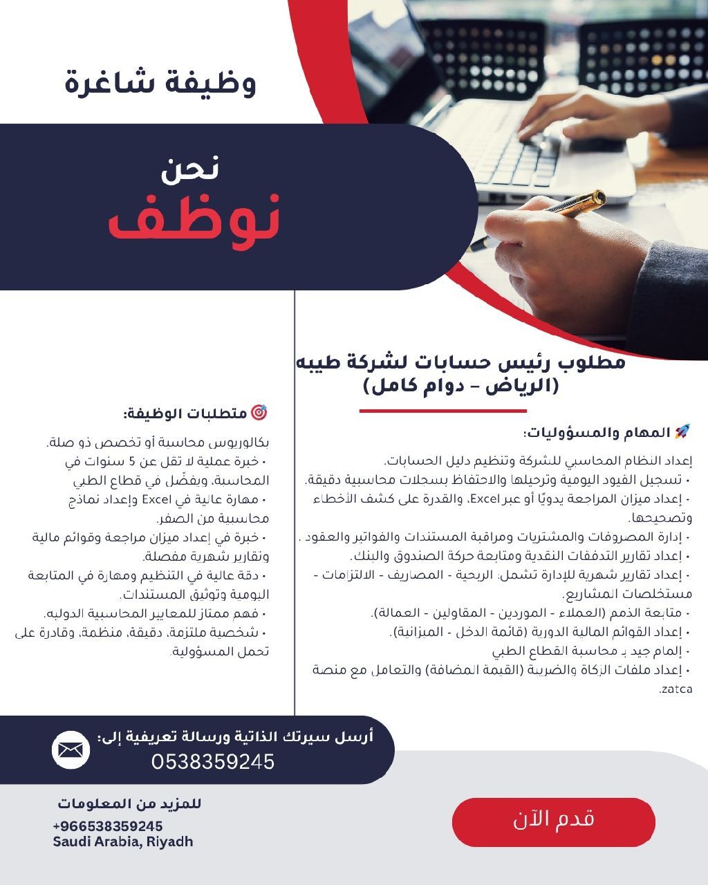 اعلان توظيف مطلوب رئيس حسابات لشركة طيبة (الرياض - دوام كامل)