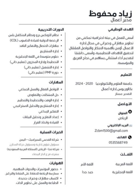 ابحث عن عمل اسمي زياد محفوظ يمني الجنسية لدي بكالوريوس إدارة أعمال. لدي القدرة، والمهارات ودورات في التواصل الفعال والعمل الجماعي وحل المشكلات والتفاوض وإدارة الوقت والتخطيط والتنظيم وإدارة المشاريع والتحليل الاستراتيجي والتفكير الابداعي واعداد التقارير وتحليل البيانات باستخدام Excel وPower BI والقيادة واتخاذ القرار أسعى للعمل في بيئة احترافية تمكنني من تطوير مهاراتي وخبراتي في مجال إدارة الأعمال