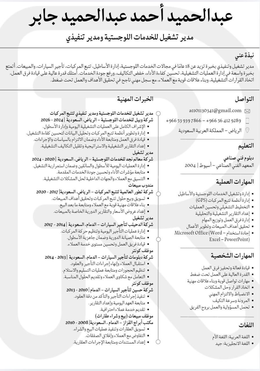 مدير تشغيل خدمات لوجستية فود وكنت اعمل مسؤول تشغيل تأجير سيارات مدير تنفيذي لشركة تتبع مركبات ابحث عن عمل في الرياض