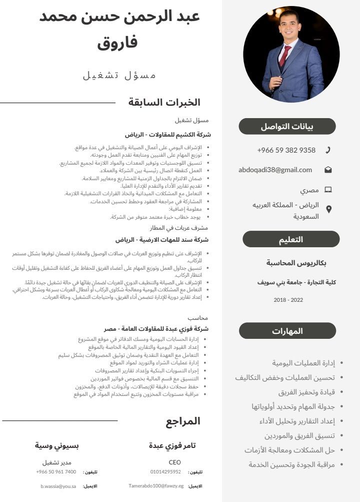 ابحث عن فرصة عمل في مجال إدارة وتشغيل المشاريع لدي خبرة عملية في تشغيل وإدارة المشاريع بما يضمن تحقيق الكفاءة وجودة التنفيذ اعداد دراسات الجدوى الفنية والمالية ورفعها على منصة اعتماد جدولة وتنظيم مواعيد طلبات العمالة بالساعة عبر تطبيق مطلوب إدارة حركة السيارات وضمان التوزيع الفعال للموارد أتمتع بمهارات عالية في التنسيق وتحليل البيانات والعمل تحت الضغط وأسعى دائما لتحقيق أفضل النتائج