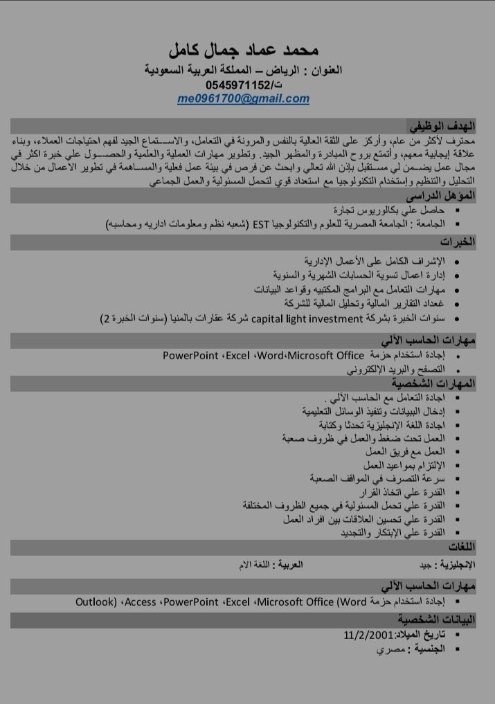 خبرة في أعمال الادارة وادارة المشاريع والمحاسبه ويوجد إقامة سرية ورخصة سارية