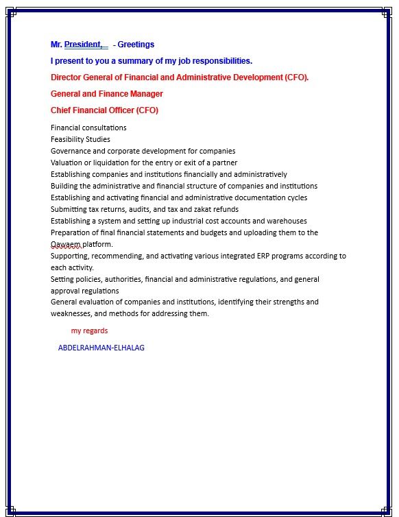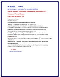 مدير مالي واداري (CFO) مدير عام التخطيط والتطوير المالي والاداري خبرة أكثر من 23 عام بكبرى الشركات الصناعية العالمية والتجارية والقطاعات المختلفة (مصانع - شركات تجارية وخدمية - مؤسسات وشركات كبرى - مستشفيات - مطاعم - مؤسسات وشركات فردية صغيرة ومتناهية الصغر - جمعيات خيرية - للتواصل ايميل