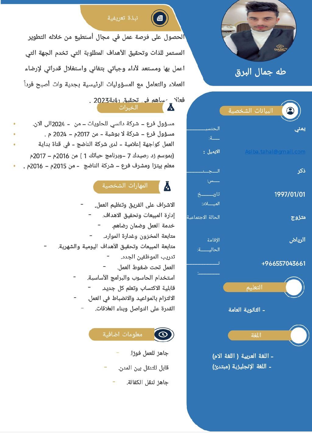 أنا طه جمال البرق، يمني الجنسية، امتلك خبرة تفوق 10 سنوات في إدارة الفروع، التسويق الاعلامي، وصناعة الأغذية. عملت في شركات مثل دانسي، لا بوشيءة، والناضج، وظهرت اعلاميا في قناة بداية. أتميز بقيادة الفرق، تنظيم العمل، متابعة المخزون، واستخدام الحاسوب بكفاءة. ملتزم، منضبط، وأتحمل ضغط العمل