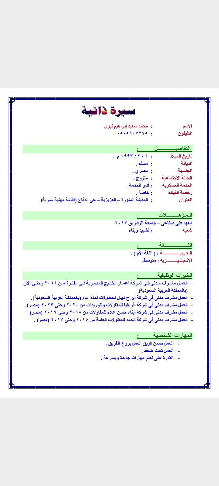 مشرف مواقع / منسق أعمال خبرة أكثر من 10 سنوات في مجال المقاولات والصيانة داخل السعودية ومصر. خبرة في الاشراف والمتابعة والعمل تحت الضغط وسرعة التعلم. حاصل على معهد فني صناعي - تشييد وبناء. ابحث عن فرصة عمل داخل المملكة العربية السعودية