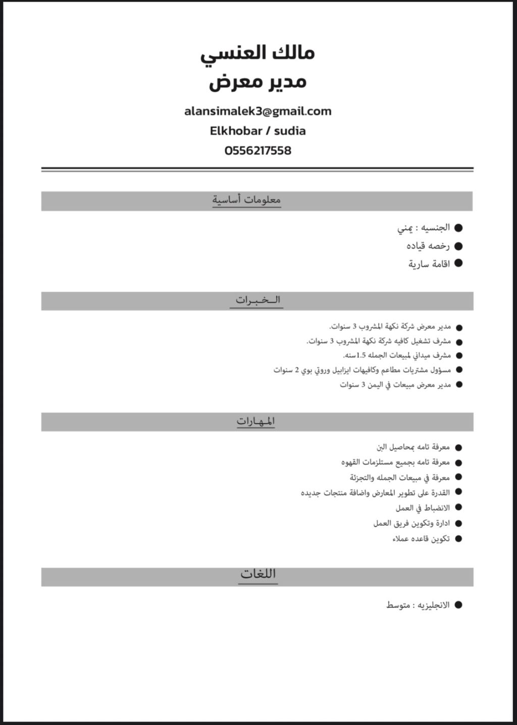 ابحث عن عمل لدي خبرة في ادارة الكافيهات ومعاوض القهوة أكثر من ثلاث سنوات مبيعات جملة وتجزئة