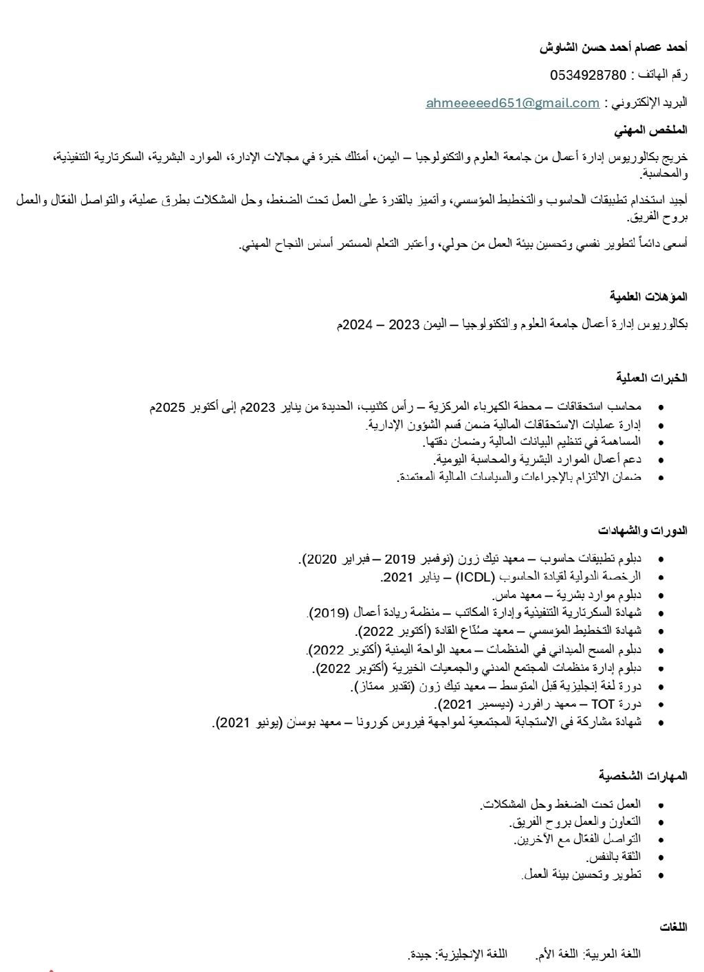 باحث عن عمل إدارة أعمال موارد بشرية خريج بكالوريوس إدارة أعمال يمني الجنسية لدي خبرة عملية في الشؤون الادارية والمحاسبية واستحقاقات الموظفين. أجيد استخدام الحاسب الآلي وتطبيقات الأوفيس، والعمل تحت الضغط، والتواصل الفعال والعمل بروح الفريق. أسعى لفرصة عمل مناسبة في بيئة احترافية أستطيع من خلالها تطوير مهاراتي متواجد في الرياض