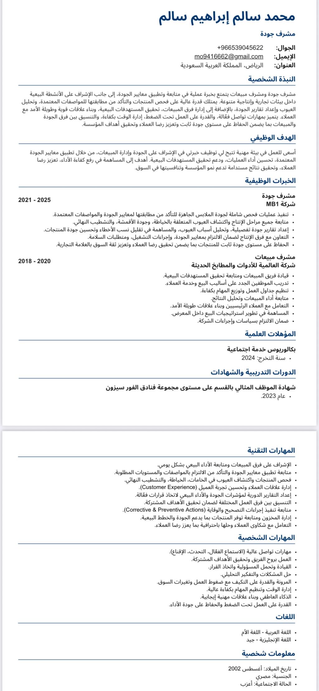 ابحث عن عمل في مصنع ملابس (مشرف جودة خبرة 4 سنوات في قسم الاشراف)