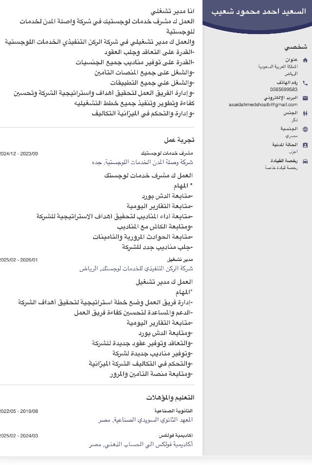 أنا مدير تشغيل’ خبرة 3 سنين في مجال الخدمات اللوجستية وعندي الخبرة الكافية في إدارة التشغيل وخبرة في الدش بورد وستقطاب المناديب