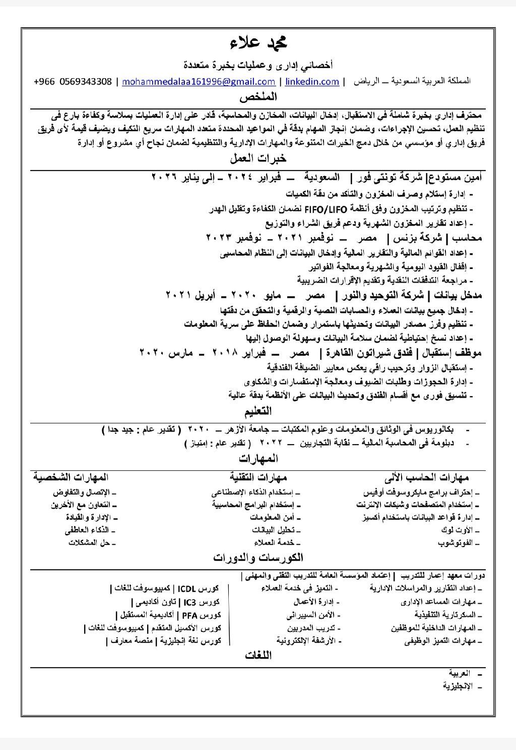 محترف اداري وتشغيلي بخبرة في إدارة المكاتب، اعداد التقارير، ادخال وتحليل البيانات، وإدارة المخزون بدقة وفق أنظمة FIFO / LIFO. أتميز بالتنظيم، سرعة الانجاز، ودعم فرق العمل لضمان كفاءة التشغيل وتقليل الأخطاء. أجيد استخدام برامج Microsoft Office والأنظمة الادارية، وأسعى لتطوير مهاراتي باستمرار واضافة قيمة حقيقية لأي جهة اعمل بها. متاح للعمل فورا وجاهز لتحمل المسؤولية