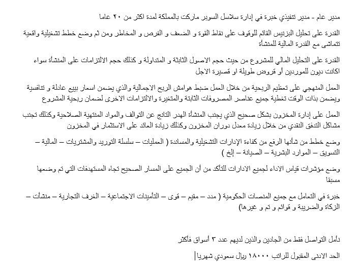مدير عام - مدير تنفيذي خبرة في إدارة سلاسل السوبر ماركت بالمملكة لمدة أكثر من 20 عاما