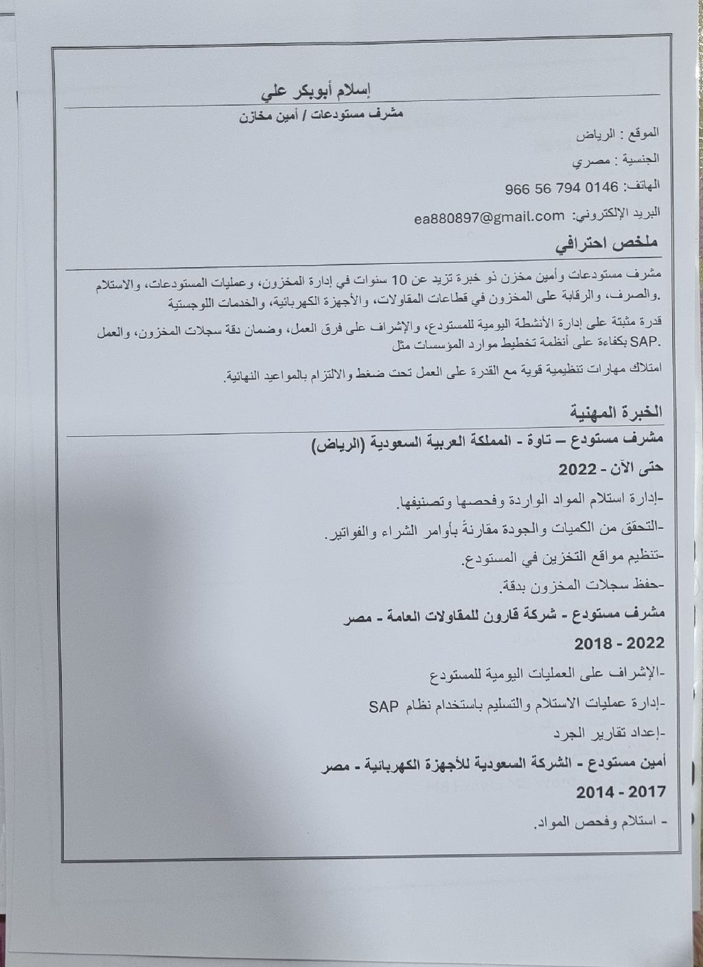 مشرف مستودع سنتين وأمين مستودع 9 سنوات في مجال الأغذية والمقاولات وعملت على نظام يأب بزنس وان وأتعامل على برنامج الأكسيل ومراقبة المخزون وادخال الفواتير مقيم في الرياض وعلى استعداد التنقل الى محافظة أخرى