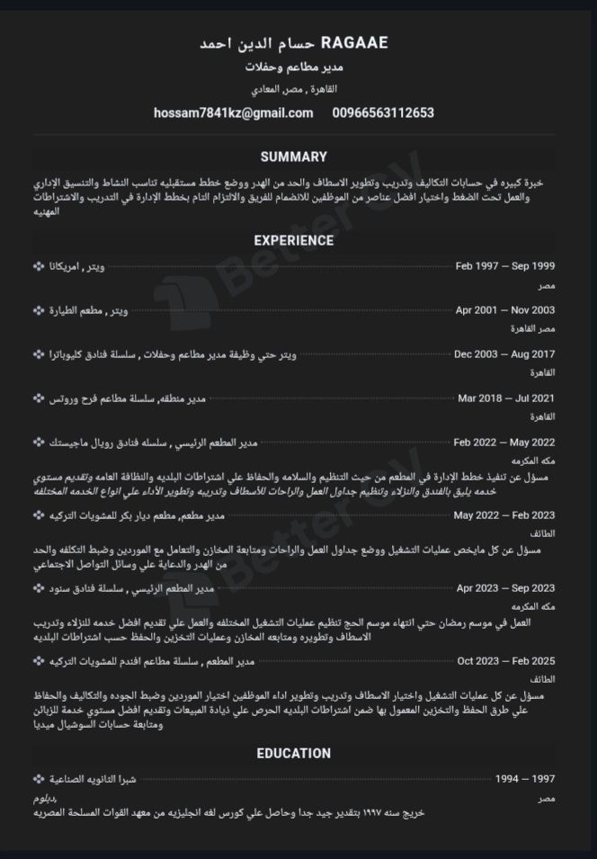 أنا مصري مقيم في مكة ابحث عن عمل في مجال ادارة المطاعم خبرة كبيرة في ادارة المطاعم وتنظيم الحفلات والمؤتمرات خبرة كبيرة في حسابات التكاليف وتدريب وتطوير الاسطاف والحد من الهدر ووضع خطط مستقبليه تناسب النشاط والتنسيق الاداري والعمل تحت الضغط والحرص علي تقديم أعلى مستوى من الجودة والخدمة المتميزه للعملاء تأشيرة عامل انشائات ومتاح نقل كفالة أو بدون