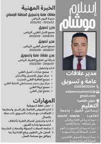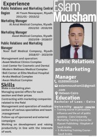 مدير علاقات عامة خبرة 12 سنة بمجال ادارة وتشغيل وتسويق مجمعات ومراكز طبية إقامة سارية - اعتماد مهني الرياض