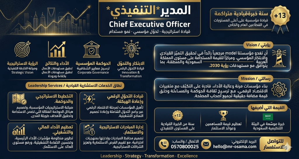 أنا مدير تنفيذي بخبرة تزيد عن 13 عاما في قيادة المؤسسات وتحقيق التحول الاستراتيجي في عدة قطاعات، امتلك سجلا عمليا في تطوير الرؤى الاستراتيجية، وتعظيم الأداء المالي والتشغيلي، وبناء هياكل حوكمة قوية تقود الى نتائج مستدامة. قمت بقيادة مبادرات التحول الرقمي واعادة الهيكلة المؤسسية، وإدارة الم بادرات والاستثمارات التي تحقق قيمة حقيقية للمساهمين وأصحاب المصلحة. أؤمن ببناء مؤسسات مرنة ومبتكرة
