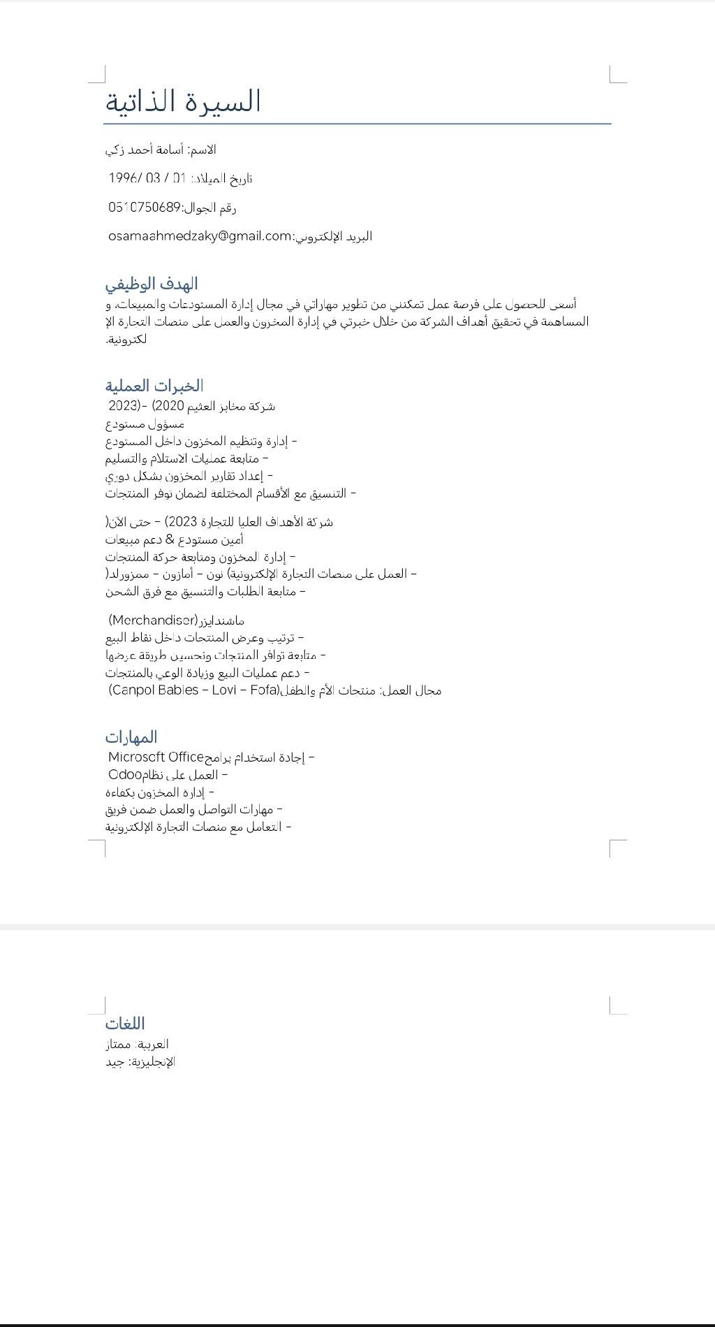 الاسم أسامة أحمد زكي ابحث عن عمل لدي خبرة في مجال العناية بألام والطفل براند كانبول بيبيز لوفي فوفا العمل على النظام أودو الخاص بالمخزون وكما أضيف أني لدي رخصة قيادة