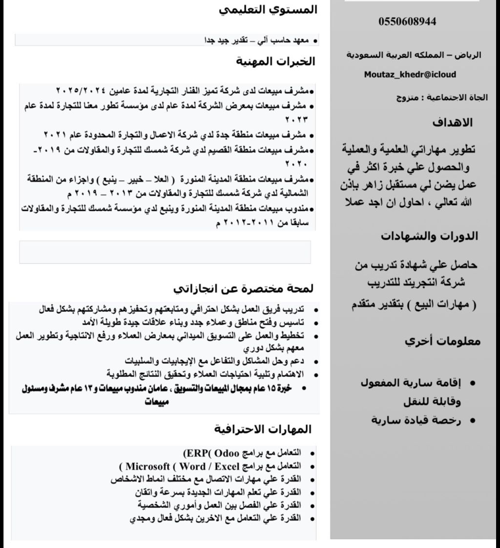 مشرف مبيعات وتسويق خبرة 16 سنة تحقيق أهداف والالتزام بخطط ورؤية الشركة مدينة الرياض
