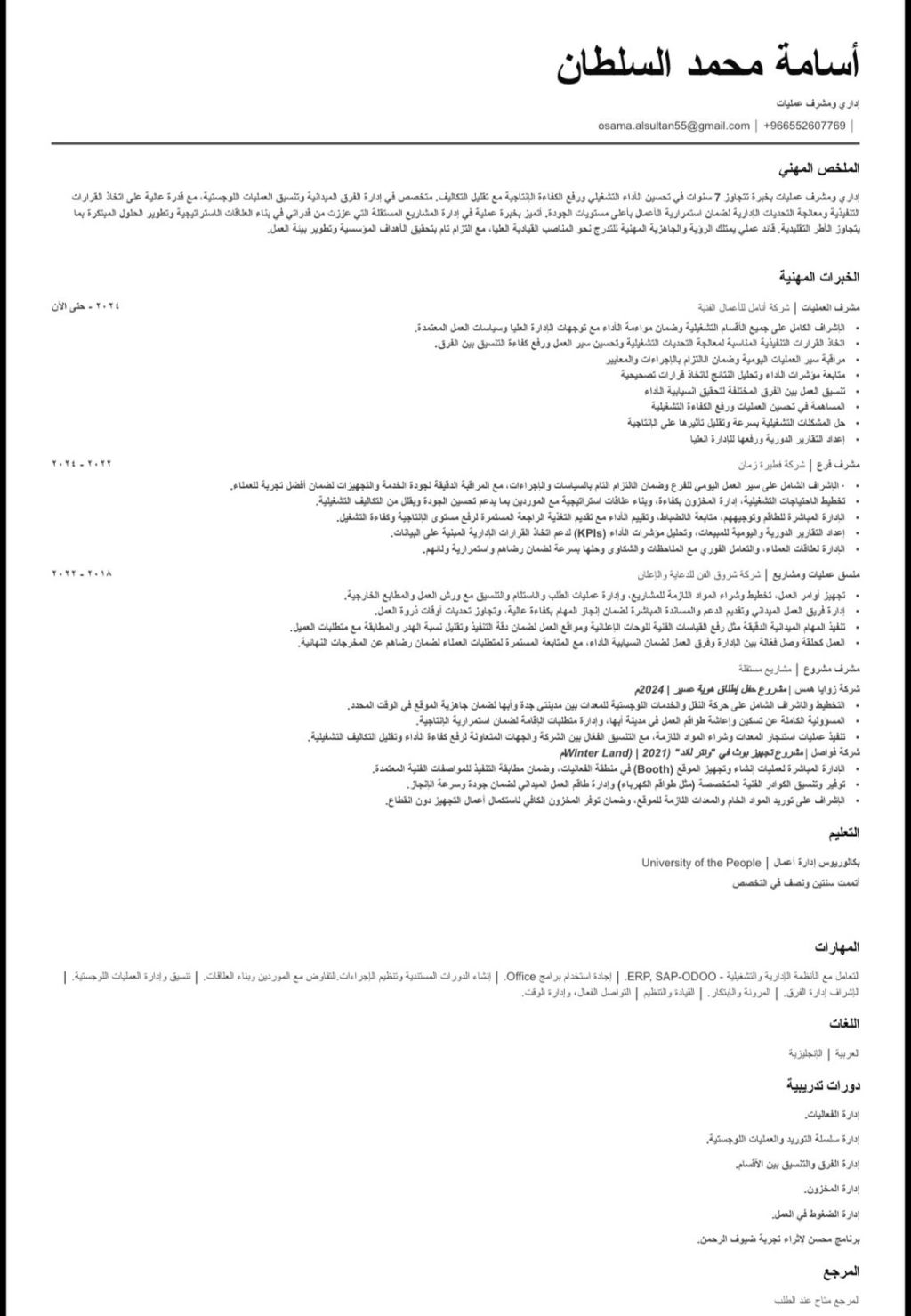 مشرف عمليات واداري خبرة 7 سنوات متخصص في تحسين الأداء التشغيلي ورفع الكفاءة مع تقليل التكاليف. المهارات إدارة الفرق الميدانية، العمليات اللوجستية، وتجهيز المواقع والمشاريع. الأنظمة اجادة تامة لأنظمة ERP (SAP - ODOO) وبرامج Office. التعليم بكالوريوس إدارة أعمال. فترة الاشعار أسبوع