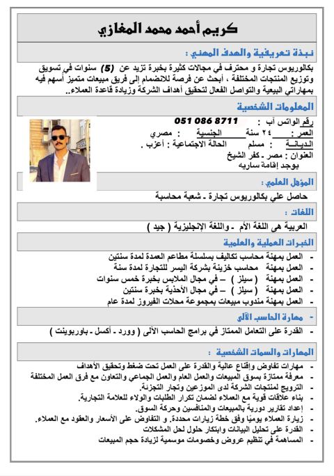 خريج كلية التربية بتقدير امتياز مع مرتبة الشرف. حاصل على دورة في الإدارة. عملت في الإدارة في أكثر من عمل. امتاز باللباقة وحسن المظهر ومحب العمل الجماعي. التفكير المستمر في نجاح المؤسسة وزيادة الأرباح. المتابعة الدائمة لأفراد العمل والعملاء وتحسين الجودة