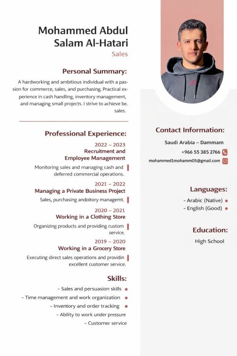 منصور محمد عبده المطري - الجنسية يمني - يبحث عن عمل ونقل كفالة الخبرات 1. خبرة في محلات الرحلات البرية 2. خبرة 3 سنوات في محلات السباكة والكهرباء ومواد البناء (بائع) 3. خبرة في الوفيات بجميع أنواعها والوجبات السريعة 4. خبرة في محلات الشاي (مشروبات ساخنة وباردة) 5. خبرة 3 أشهر في إدارة المطاعم