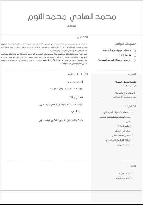 الاسم وليد نعيم الدين أحمد محمد، سوداني، بكالوريوس قانون، خبرات سابقة موظف الموارد البشرية شركة المسار العربي السعودية للمقاولات، ابحث عن وظيفة مناسبة