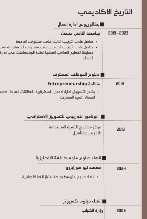 محترف اداري ومالي وتجاري متعدد المهارات، أتمتع بخبرة واسعة في قيادة وتطوير العمليات التشغيلية، إدارة الحسابات المالية، وبناء استراتيجيات التسويق والمبيعات التي تحقق النمو. أبرز ما أقدمه هو تحسين خدمة العملاء ورفع كفاءة الفرق لتعزيز الربحية ورضاء العملاء. أسعى لانضما مي لفريق عمل متميز حيث يمكنني استثمار خبرتي لتحقيق أهدافكم الاستراتيجية