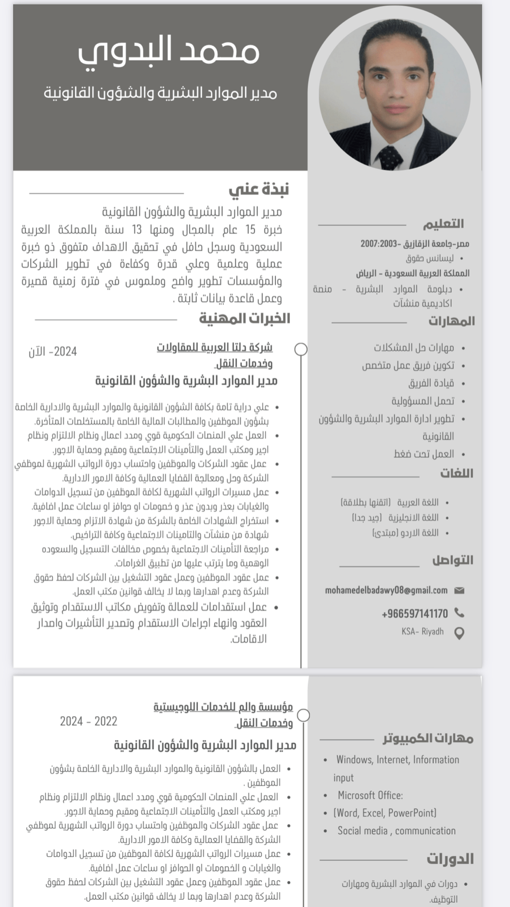 مدير موارد بشرية وشؤون قانونية لدي شركة / دلتا العربية للمقاولات والنقل. ماجستير قانون حاصل علي دورة موارد بشرية من منصة منشاءات. العمل علي جميع المنصات الحكومية القدرة علي تعيين الموظفين الأكفاء طبقا للشواغر الوظيفية صياغة العقود القانونية بين الشركات صياغة عقود الموظفين احتساب دورة الرواتب عمل مسيرات الرواتب التعامل مع القضايا العمالية وانهائها ادخال وتحديث بيانات الموظفين في النظام الالكتروني اعداد