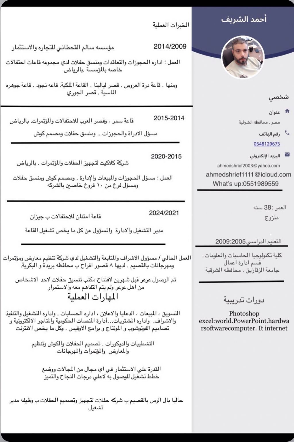 مدير تشغيل وادارة قصور وقاعات الأفراح خبرة 17 سنة في كبري شركات الاستثمار في كل ما يخص مجال الاحتفالات شامل كل أقسامه من الاستثمار في قصور الأفراح وشركات تجهيز الحفلات ومطاعم البوفيهات الخارجية