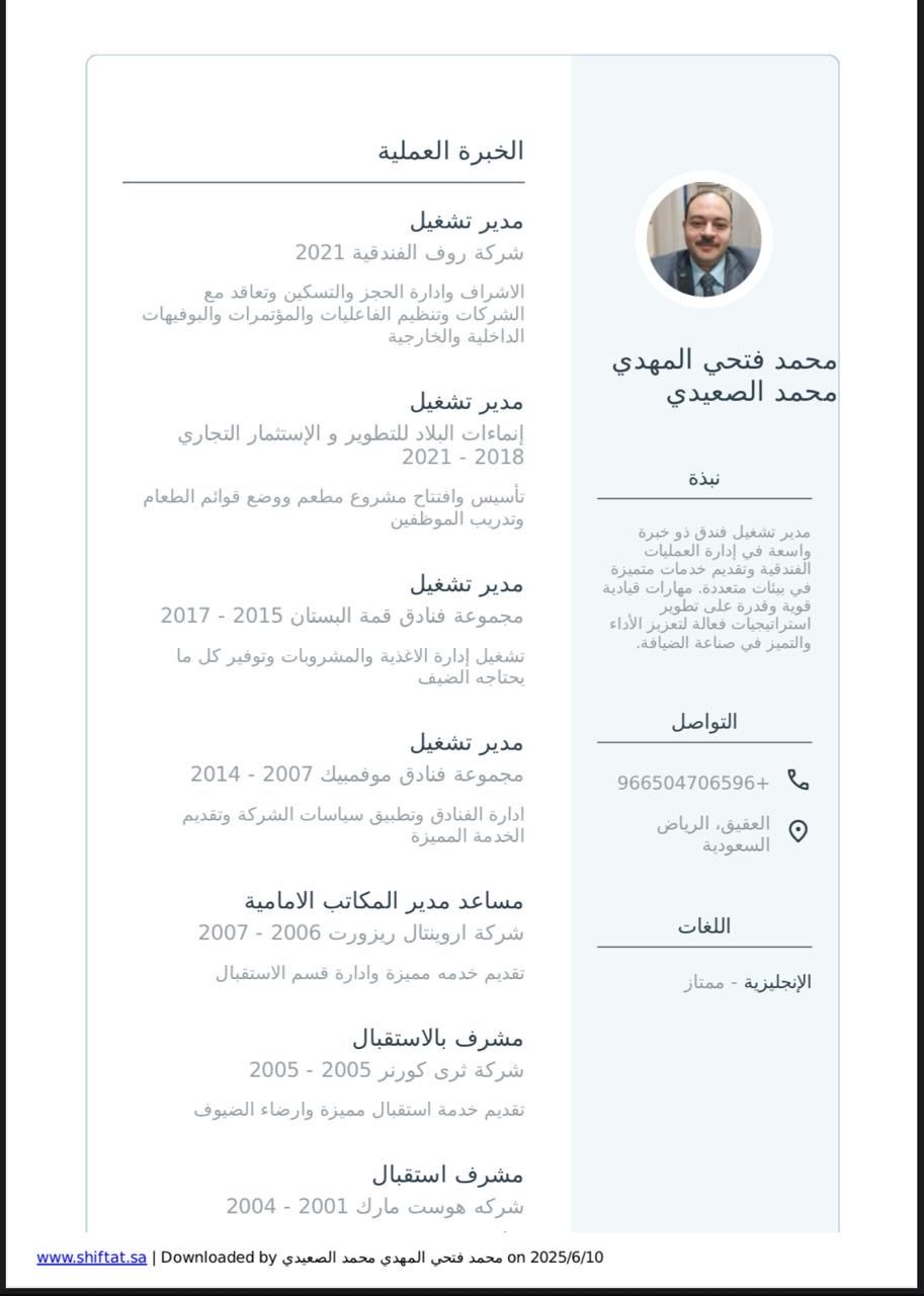 مدير تشغيل فندقي خبرة واسعة في مجال الضيافة الفندقية ورفع مستوى الخدمة وادارة الأجنحة الفندقية وتدريب الموظفين علي أداء العمل الاحترافي والمميز والمحافظة علي التكاليف اليومية وتحقيق الربحية بالقوائم المالية ومتابعة جميع أنواع مواقع الحجز بشكل مباشر واضافة حلول جديدة لتنويع مصادر الدخل وتخفيض المصروفات بشكل مبتكر إقامة سارية قابل للنقل