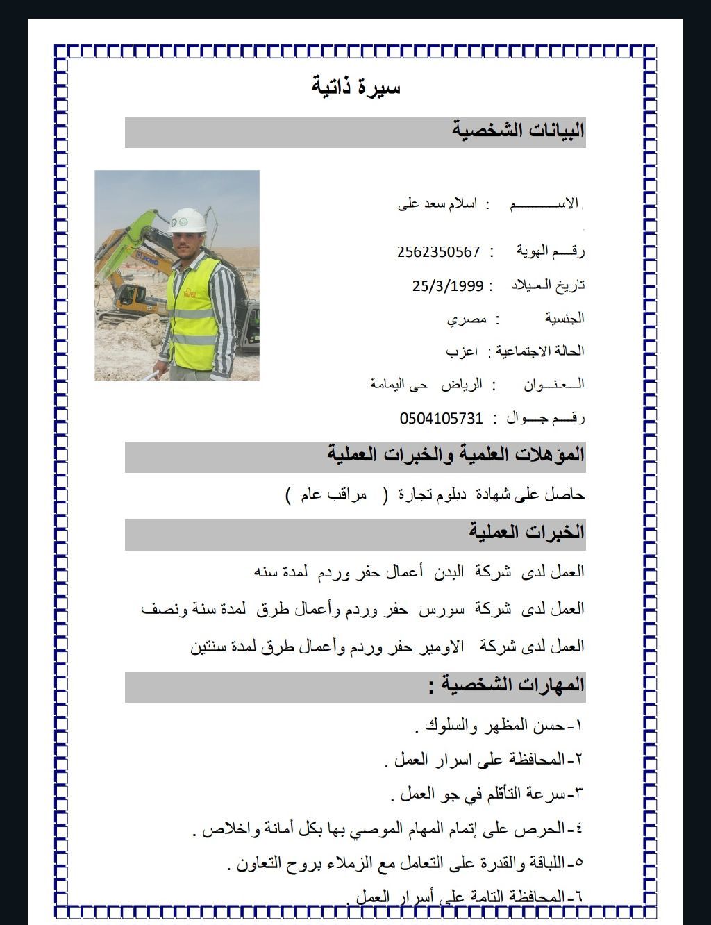 مشرف أعمال الحفر والردم وادارة وتشغيل المعدات الثقيله ومتابعه الأعطال خبرة متواجد في الرياض