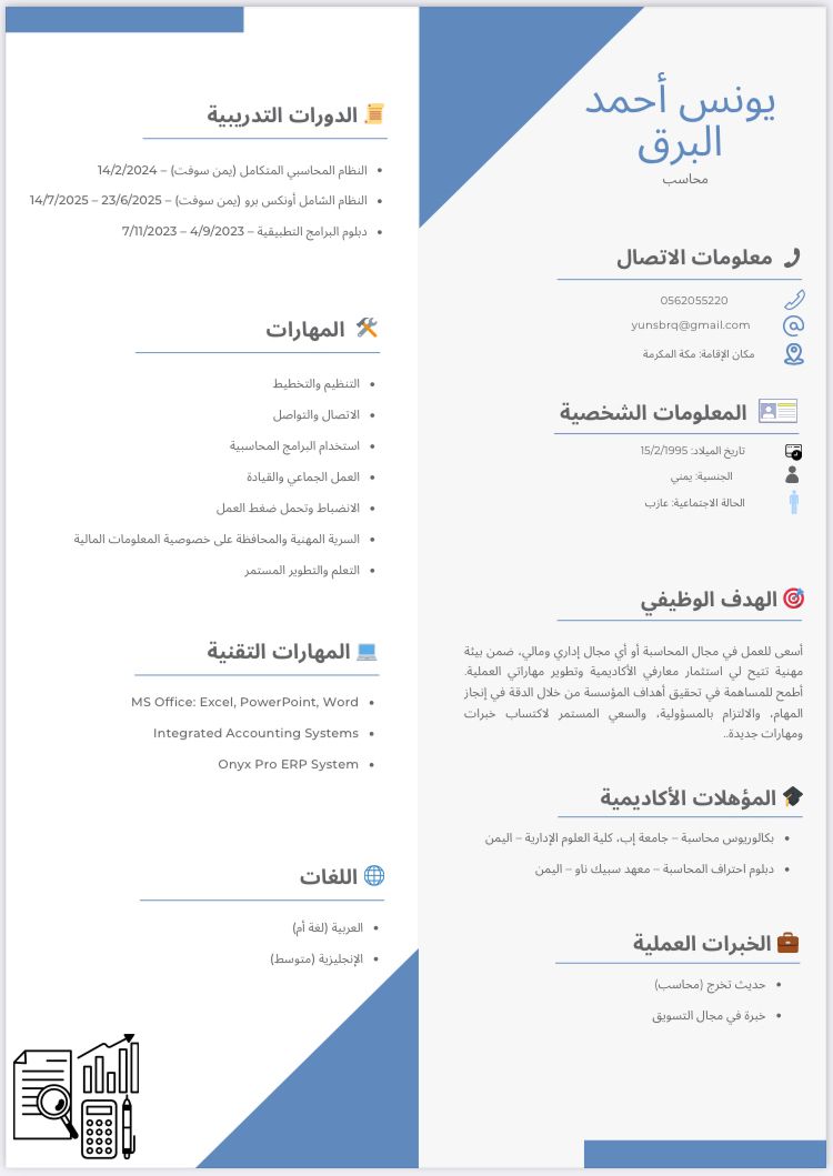 محاسب يمني حديث التخرج (العمر 28 سنة) مقيم في المملكة العربية السعودية - مكة المكرمة، ابحث عن فرصة عمل في مجال المحاسبة لدى جهة تسعى للتميز والتطوير. امتلك الحماس والدافعية لبناء مسيرة مهنية ناجحة، وأسعى لأن أكون عنصرا فاعلا وذو منفعة حقيقية للمؤسسة من خلال الالتزام، الدقة، والتعلم المستمر. أطمح للمساهمة في تعزيز الكفاءة المالية وتحقيق الأهداف التشغيلية والمالية للمؤسسة مستعد للعمل في أي مكان