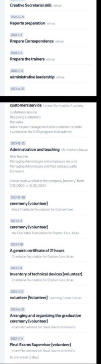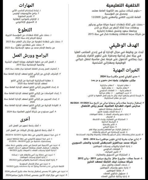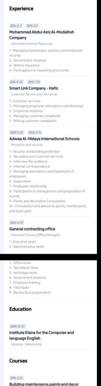 ابحث عن عمل مكتبي حضور أو عن بعد أو كلاهما والوظيفة تكون باللغة العربية فقط وفي شمال مدينة الرياض لدي الجنسية السعودية والعمل باليوم أو بالساعة الراتب استلمه بنفس الوقت واليوم (كل ساعة بوقتها) أو دوام جزئي (كل بداية أسبوع) قوله (أعطوا الأجير أجرة قبل أن يجف عرقة) ورجاء فقط الجهات المهتمة بتعييني وتوظيفي من يتواصلوا معي والدوام يكون من الصباح ل العصر ليس لدي أي اهتمام بأي وظيفة دوامها بعد العصر ينتهي