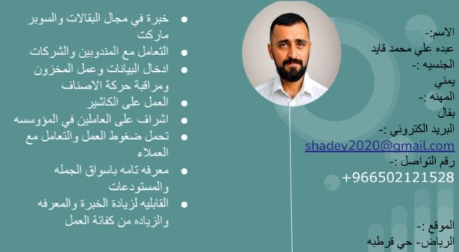 Grocery worker, supermarket supplies markets, 7 years of experience, data entry, monitoring inventory and goods movement, activating work and workers, and developing plans that serve the work, skilled in management, dealing with representatives, dealing with customers, I have complete knowledge of wholesale markets and their warehouses. To contact