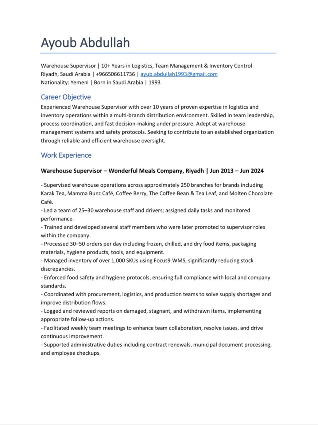 I am seeking a job in warehousing or administration. I have over 11 years of experience in managing and storing food products (frozen, chilled, and dry) tools, and equipment. I am skilled in team supervision, employee development, and accurate inventory control, with a strong commitment to safety, quality, and achieving company goals